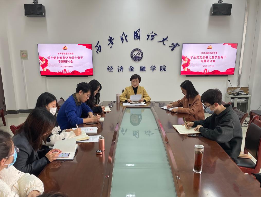 2021年11月4日下午,青青草视频 在JE310会议室召开学生党支部书记及学生骨干专题研讨会,学院分党委副书记王开琴、各学生党支部书记以及学生副书记、组织委员、宣传委员参加会议,会议由王开琴主持。