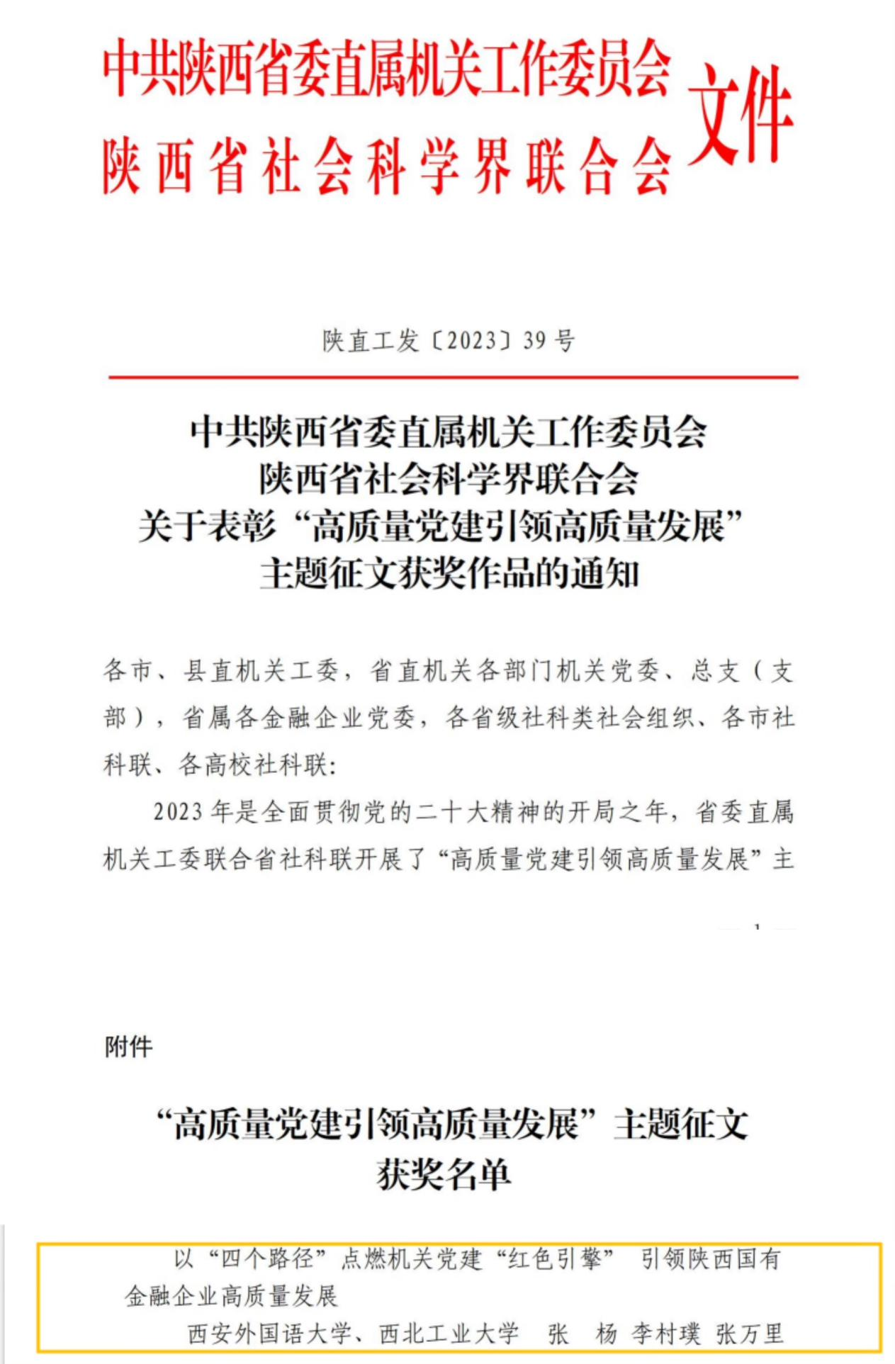 近日,中共陕西省委直属机关工作委员会和陕西省社会科学界联合会公布了“高质量党建引领高质量发展”主题征文评选结果,我校青青草视频 张杨副教授、李村璞教授与西北工业大学张万里副教授撰写的《以“四个路径”点燃机关党建“红色引擎” 引领陕西国有金融企业高质量发展》一文荣获服务高质量发展类二等奖。
