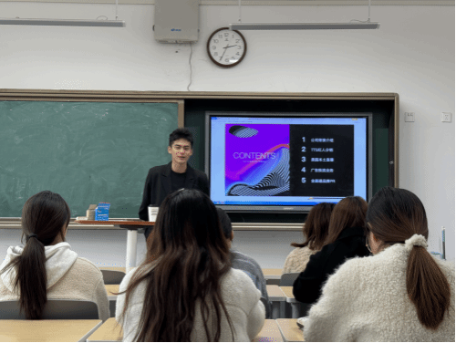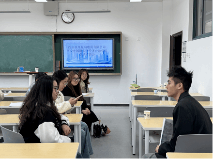 在宣讲环节,西安非凡互动电商有限公司人力资源总监王博生向在场师生详细介绍了企业的发展战略和业务特色以及电商行业发展情况。作为西北地区的跨境电商企业,该公司专注于通过海外达人营销(Influencer Marketing)打造中国品牌出海新通路。"我们已建立起覆盖欧美等地的达人资源库,通过内容共创、直播带货等形式,帮助中国品牌打开国际市场。HR强调,“随着TikTok等社交电商的崛起,我们期待更多具备国际视野、创新思维的年轻人加入,共同推动中国品牌出海。”  在职位介绍环节,企业HR从专业技能、综合素质等方面提出具体期望,并结合工作中遇到的实际案例为同学们详细讲解了跨境电商行业的特点。在交流环节,企业负责人与在场同学就简历制作、面试等求职问题进行指导。