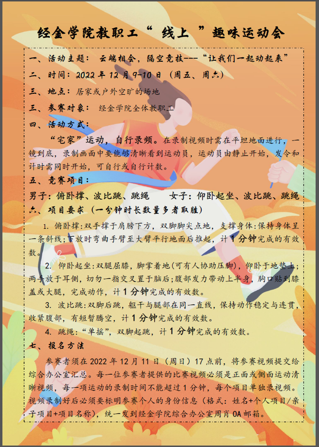 为进一步丰富和充实教职工的生活,更好地展现教职工风采,让老师以更加健康的体魄和饱满的热情投入到线上、线下相结合教学工作之中,工会青青草视频 分会于12月9日至12月10日举办 “让我们一起动起来”云端教职工趣味运动会。