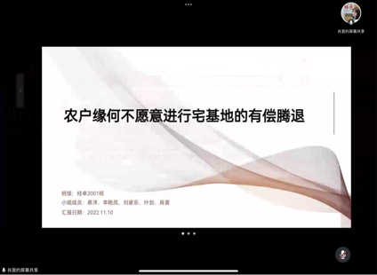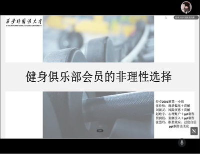张小筠老师给2020级经济学专业同学介绍了行为经济相关理论,包括确定和不确定条件下的行为选择理论、跨期行为选择理论等。同学们运用上述理论,结合现实经济行为,分组进行了案例分享。其中,经济卓越班刘新灵等同学运用“现状偏见”、“过度自信”、“当下享乐偏误”等理论对健身俱乐部会员的非理性行为进行了解析,并结合专家关于健身俱乐部会员的调查数据,分析了健身俱乐部会员的行为特征。肖晋等同学运用“现状偏见”、“锚定效应”、“禀赋效应”等理论探讨了农户在不确定性和信息不完全的环境下不愿进行有偿腾退的原因。邹淑玥等同学运用“可得性启发”、“准双曲线贴现”、“损失厌恶”等理论对家庭能源消费行为特征进行了分析,进而为促进家庭低碳消费与相关政策制定提供了新的视角。