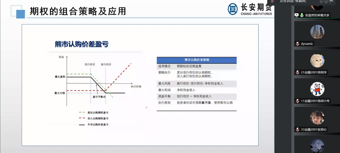 长开经贸有限公司交易员张晨哲、长安期货农产品研究员刘琳分别给金融学专业、金融CFA和信管专业2020级学生进行了《期权交易策略》授课。张晨哲老师主要讲解了单一期权的交易策略、期权的组合交易策略和期权的套期保值策略。刘琳老师讲授了期货、期权交易与看盘要点等交易策略,引导同学们尝试进行模拟操作,为后期进入市场实际操作打好基础。