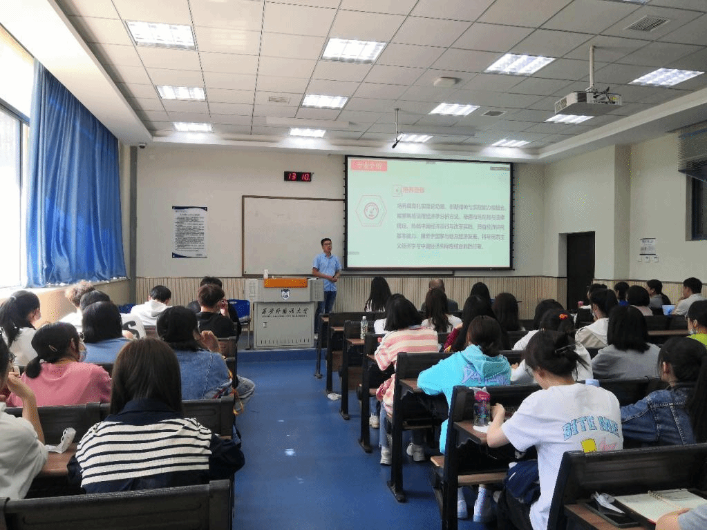 其次,王恒老师分别从教学团队、专业介绍、课程体系与发展前景等方面做了详细的讲解,让新生对经济学的培养目标、专业特色、学习方法以及未来就业境况有了全方位的了解,对经济学专业部分优秀毕业生大学学习情况和毕业去向进行了介绍。同时提出了对新生的期望和要求,鼓励大家要保持积极的心态,认真对待每一门课程,注重对知识的积累,培养专业素质,全方位地提升自己的专业能力。