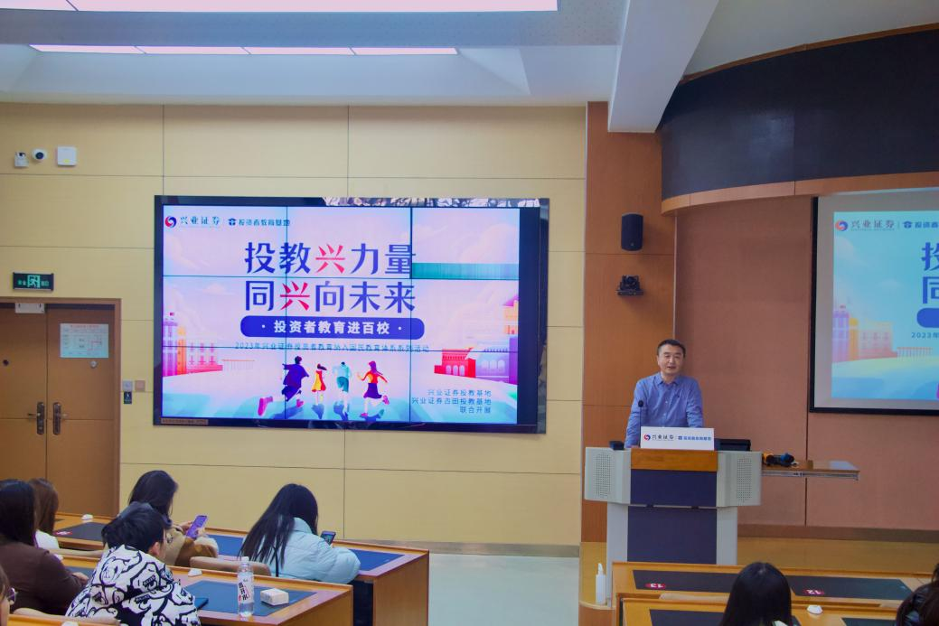 首先,由兴业证券陕西省分公司资深投资顾问许朝威老师讲授讲座的第一部分,主题为“投资兴力量,同兴向未来”。许老师先为同学们科普了证券领域防诈骗相关知识,提醒大家提高警惕。其次,老师为初步设想在证券行业发展的同学树立了明确的大学学习目标。接下来,许老师总结了职业发展四大路径——营销、专业、管理以及后台路线,明确指出个人发展离不开这四大路径,并且建议同学们一定要结合个人优势选择未来路径。然后许老师还详细讲述了证券市场快速发展的阶段和主要特征,增进了同学们对于证券市场的了解。