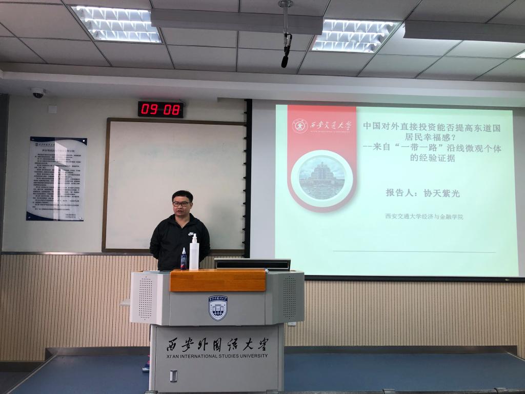 西安交通大学博士协天紫光受国际贸易学二级学科带头人吕寒教授邀请,为师生们作了题为“中国对外直接投资能否提高东道国居民幸福感?——来自‘一带一路’沿线微观个体的经验证据”的分享交流,他从选题方向、查找数据来源、稳健性检验常用方法、处理审稿意见、计量方法等多个方面向同学们传授了学术论文写作的方法,讲解逻辑清晰,通俗易懂,同学们受益匪浅。