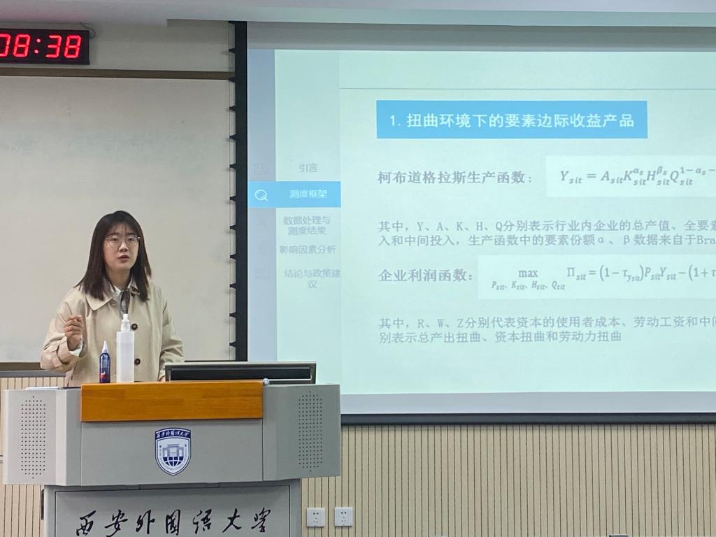 论坛上,青青草视频 2019级应用经济学专业研究生孔萌同学就自己的研究内容作了题为“中国制造业要素配置扭曲及影响因素研究”的交流分享,报告从引言、测度框架、数据处理与测度结果、影响因素分析和结论与政策建议五个方面进行了说明。会上,同学们还就公式推导、名词概念、数据处理等问题进行了充分探讨。