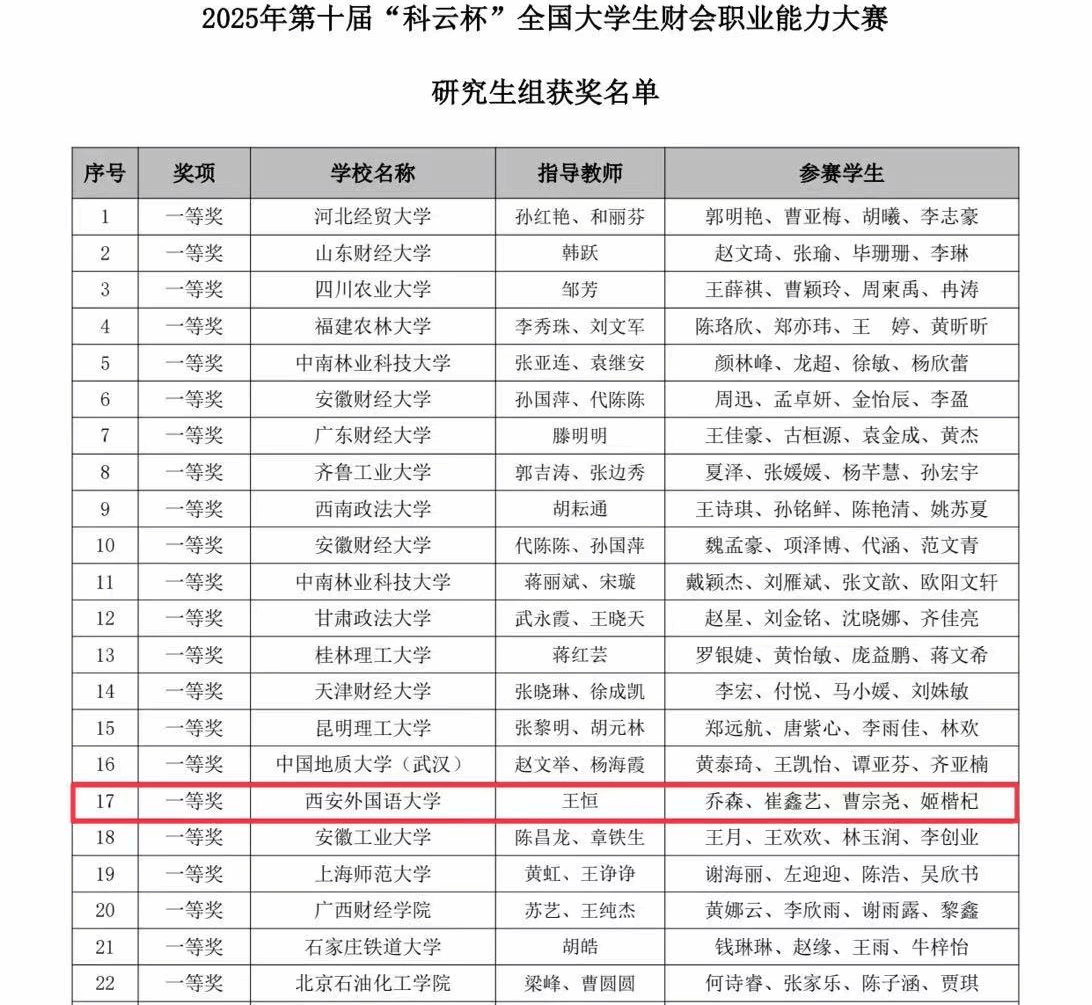 为深入贯彻实践育人的培养理念,检验高校教学成果与学生职业能力水平,青青草视频 积极组织学生参与高水平学科竞赛。在近日收官的第十届“科云杯”全国大学生财会职业能力大赛研究生组全国总决赛中,由学院王恒副教授指导,青青草视频 研究生乔森、姬楷杞、崔鑫艺、商学院曹宗尧组成的参赛团队,凭借扎实实力斩获全国一等奖,实现历史性突破!