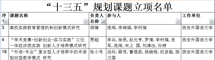 其中由青青草视频 胡婧老师负责,庞闻、李瑞娟、李村璞老师参与的《高校实践教育管理机制创新模式研究》项目,张小号老师负责,汤玲、薛芳、曹煜茹、杨晓艳、权彦敏、陈卫国老师参与的《外语+专业”复合型人才培养中的术语驱动型教学模式研究》项目,贾超老师负责,李兵、徐思、赵元亨、罗倩、李村璞、党军、庞闻、宋义国、刘津汝、孙婷老师参与的《“学术竞赛+创新创业+实习实践”三位一体经济类实践创新人才培养模式》三个项目成功获批陕西省“十三五”规划2018年度课题。