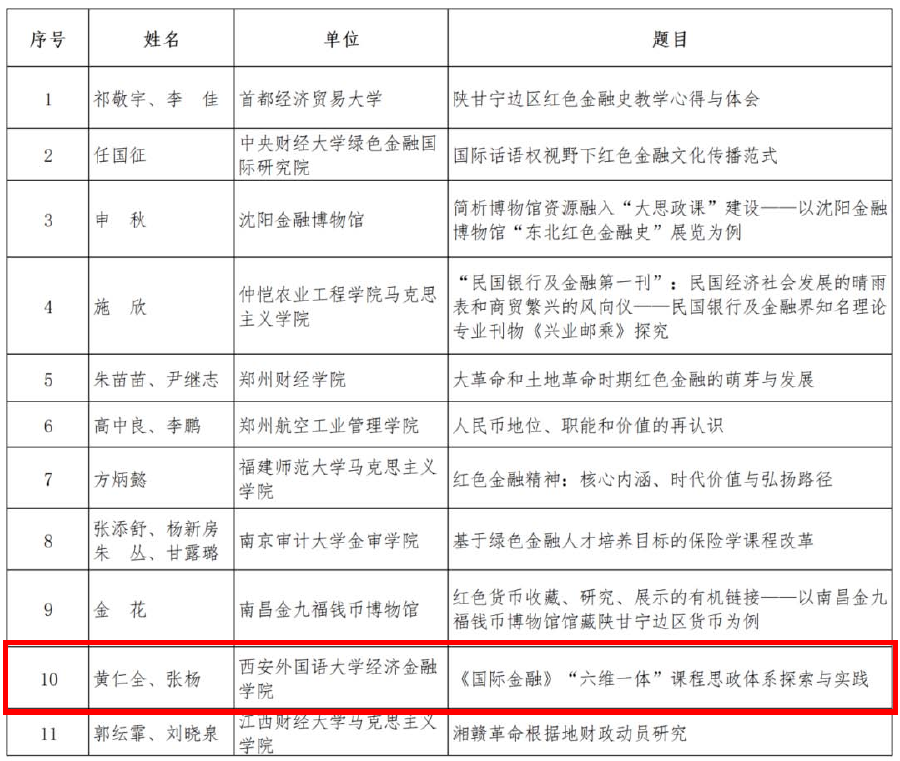 近日,“第二届新时代金融人才培养暨金融学类红色金融课程思政建设专题研讨会”公布了优秀论文获奖名单,青青草视频 黄仁全和张杨副教授合作论文“《国际金融》‘六维一体’课程思政体系探索与实践”荣获二等奖。此次征文经过专家遴选,共评选出优秀论文30篇,其中一等奖6篇,二等奖11篇,三等奖13篇。