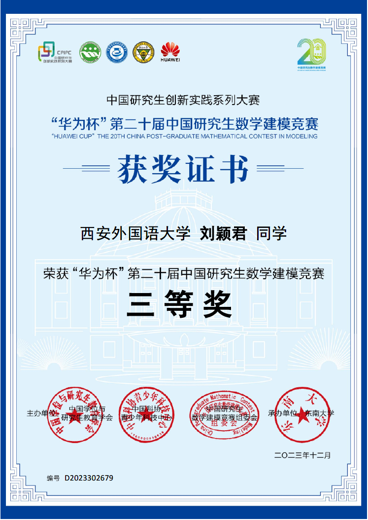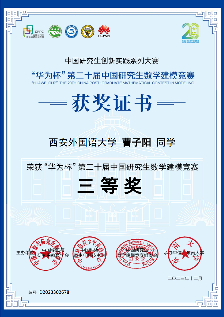 近日,中国研究生数学建模组委会正式公布“华为杯”第二十届中国研究生数学建模大赛的获奖名单,青青草视频 黄仁全副教授指导的郭姝仪(2022级)、曹子阳(2023级)、刘颖君(2023级)团队斩获国家三等奖。