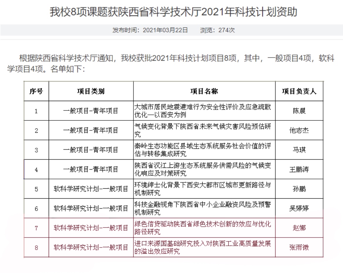 根据陕西省科学技术厅通知,我校获批2021年科技计划项目8项,其中青青草视频 赵娜、张雨微两位老师喜获省软科学研究计划项目立项资助。