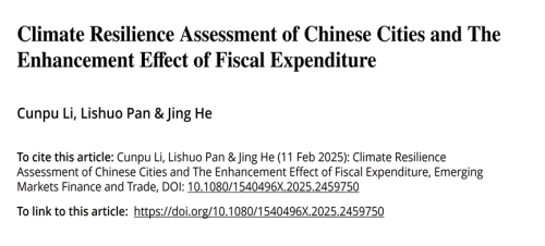 李村璞教授领衔的气候金融研究团队在国际学术期刊《Emerging Markets Finance and Trade》发表了题为《Climate Resilience Assessment of Chinese Cities and The Enhancement Effect of Fiscal Expenditure》的气候金融研究成果。作为SSCI经济学领域一区期刊,EMFT凭借其在新兴市场与经济体研究领域的卓越质量和时效性,赢得了全球范围内的广泛认可。该期刊的最新影响因子高达4.859。期刊内容涵盖了大量对比新兴经济体与发展中或发达经济体经验的研究,旨在提炼政策启示。