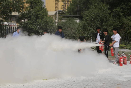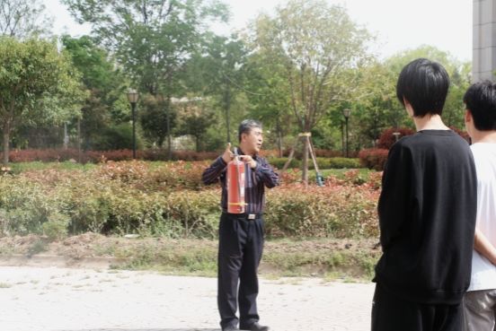 随后,在室外开展校园消防实践,保卫处负责老师向大家展示灭火器,防烟面罩,消防水带等器材的正确使用方法,学生代表体验穿戴消防服,使用灭火器扑灭模拟火源。在模拟演练中,每位学生完成安全疏散演练并初步熟练掌握灭火器的操作技能,提升了应对突发火灾的实战能力,进一步巩固了消防安全知识