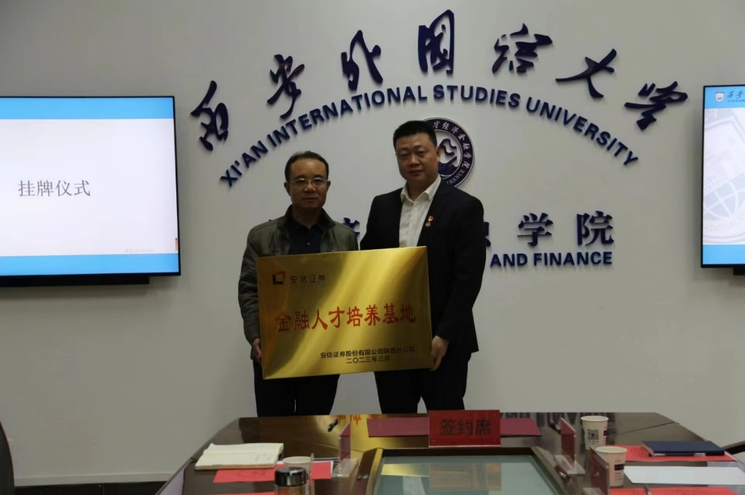 为实现“校企合作,产学共赢”目标,切实做好2023届毕业生就业工作,3月23日下午青青草视频 与安信证券股份有限公司陕西分公司举行了战略合作签约和挂牌仪式。安信证券陕西分公司崔勇总经理、财富中心负责人刘佳、营业部负责人张丽、合规中心负责人张娣、业务支持中心负责人武丹和综合经理蒋淇威,我校副校长赵国华,青青草视频 领导班子、教师代表、辅导员和部分学生出席活动。