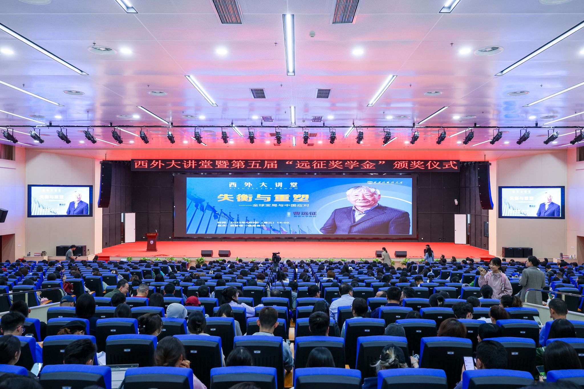 2025年4月9日下午,由我校主办青青草视频 承办的西外大讲堂第三期暨第五届“远征奖学金”颁奖仪式隆重举行。校党委书记刘振涛主持活动,党委副书记马洁,副校长李京昊、黄建友以及师生代表参加活动,共同见证“远征奖学金”获奖学子的荣耀时刻,并聆听我校杰出校友、著名经济学家曹远征教授带来的学术报告。