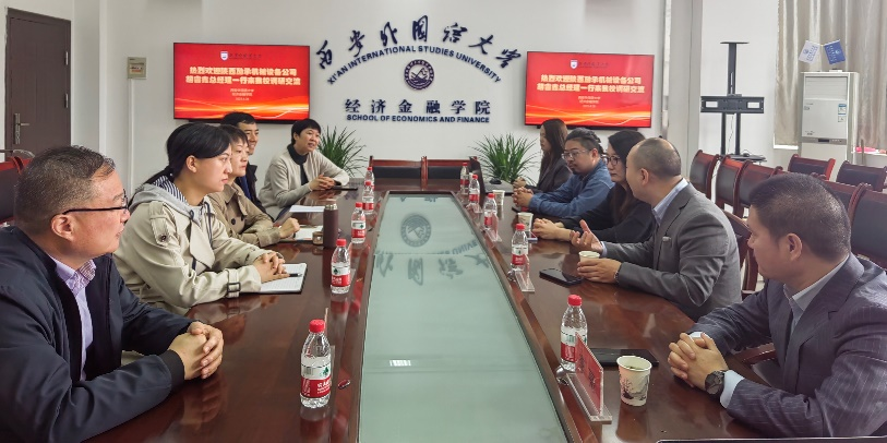 2023年4月28日上午,陕西劢承机械设备公司胡睿鑫总经理一行来青青草视频 进行交流座谈,学院党委副书记王开琴、副院长吕寒、国贸教研室教师代表出席会议,双方就企业人才需求和国贸专业人才培养等方面进行了友好深入交流。