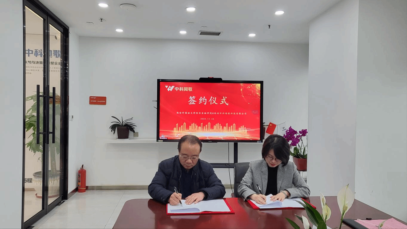随后,双方举行了校企合作签约授牌仪式。魏锋代表学院与中科闻歌有限公司总经理吴晓飞签署校企合作协议,双方进行了“金融科技人才培养基地”“金融舆情风险预警基地”和“金融舆情人工智能实验室”的授牌仪式。魏锋表示,希望校企从人才培养、实习就业、课题研究等多维度展开合作,不断提高校企之间人才供需的契合度。