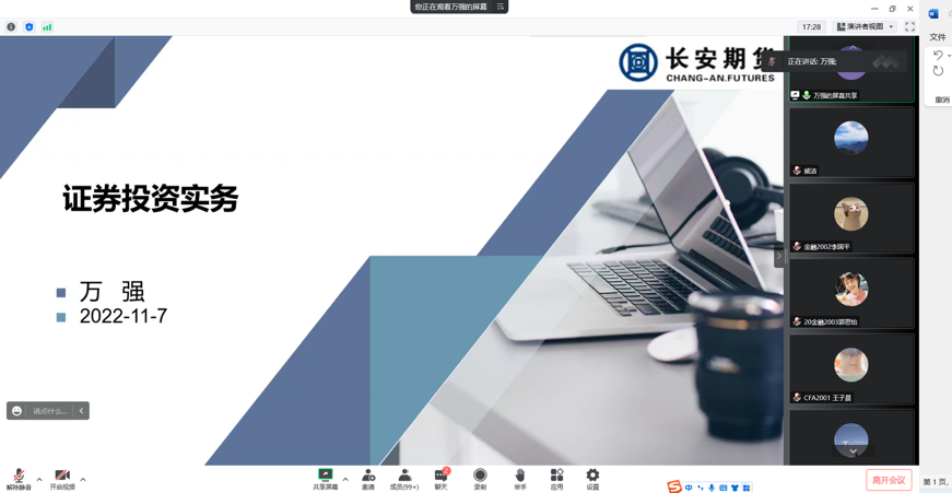 此外,长开经贸有限公司交易员张晨哲老师带来了期权专题介绍,张老师的讲解内容全面而深刻,同学们受益匪浅。在会议最后,老师还对同学们的问题予以解答,让参与的同学收获满满,对金融行业有了更清晰的认知。
