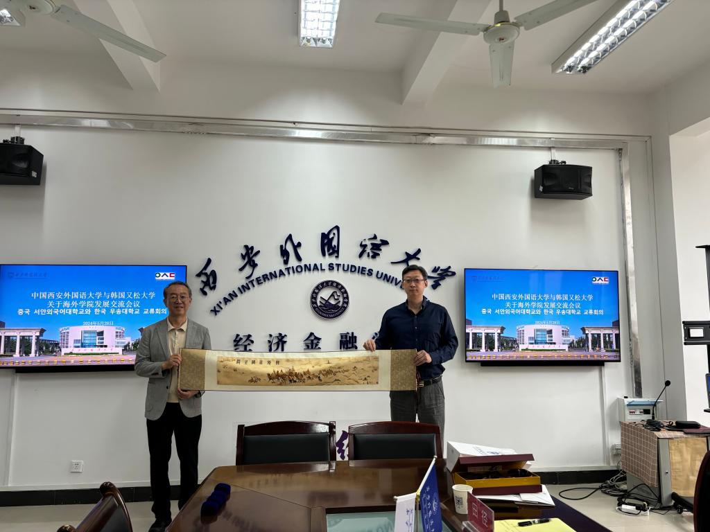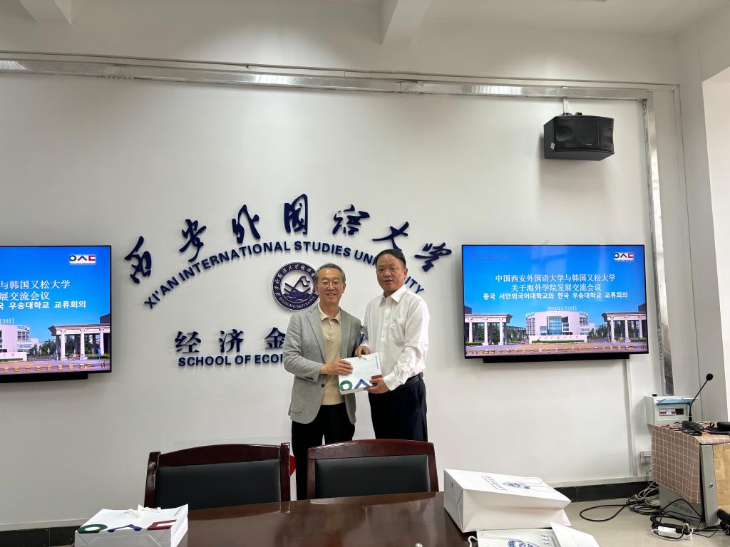 景楠处长首先代表学校致欢迎词,对韩国又松大学一行前来我校交流热烈欢迎。景处长向新调入又松大学的柳在润处长介绍了我校的发展、学科、办学特色和两校的国际交流合作情况。柳在润处长感谢西外一直以来在国际合作交流中给予的信任与支持,邀请我校在又松大学70周年校庆之际访问又松大学。随后,李村璞院长、刘念处长等人就目前已有合作项目的进展和未来合作方向的规划等问题进行了深入沟通与交流。在交流中,双方均表达了提升交流与合作深度、广度的强烈愿望。会议结束后,双方互赠了象征友谊的礼物。(图文:张茜;审核;吕寒)