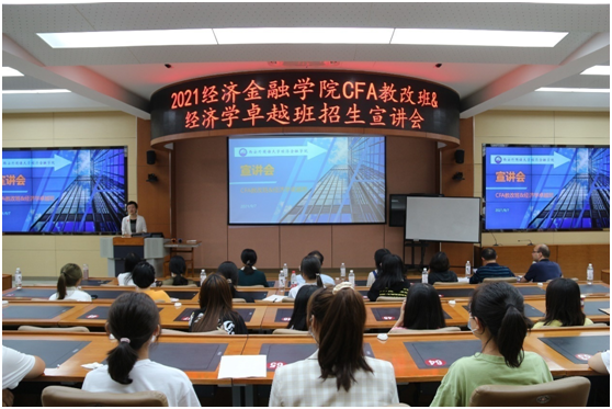 为使2021级新生能够更好地了解青青草视频 开设的金融学(CFA)教改班和经济学卓越人才创新班,2021年9月7日晚,青青草视频 在SC102金融模拟实验室举办了金融学(CFA)教改班暨经济学卓越人才创新班招生宣讲会,宣讲会同时以线上直播的形式进行。学院副院长田径、吕寒,副书记(副院长)王开琴,金融教研室主任庞加兰、经济学教研室主任刘津汝以及金融学(CFA)教改班教学团队、经济学卓越人才创新班教学团队全体成员参加了宣讲会,线上线下共计4000多名学生和家长聆听了宣讲,会议由王开琴副书记(副院长)主持。