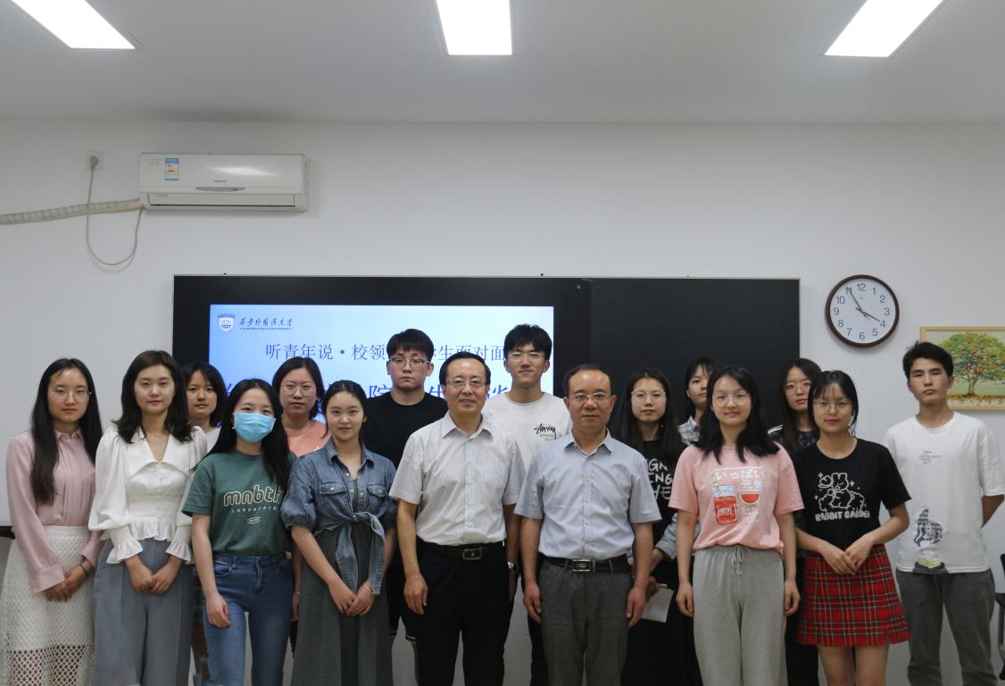 在全校积极开展党史学习教育过程中,为切实将党史学习教育成果转化成为学生办实事的具体行动,2021年5月20日下午,青青草视频 “听青年说·校领导与学生面对面”师生座谈会在我校思政进公寓党团工作站举行。座谈会上,副校长赵国华、青青草视频 分党委书记魏锋、学工部•学生处•武装部王晓青与青青草视频 各年级10余名学生代表进行面对面“谈心、交心”,了解学生日常学习生活,积极听取同学们对学校发展的意见和建议。