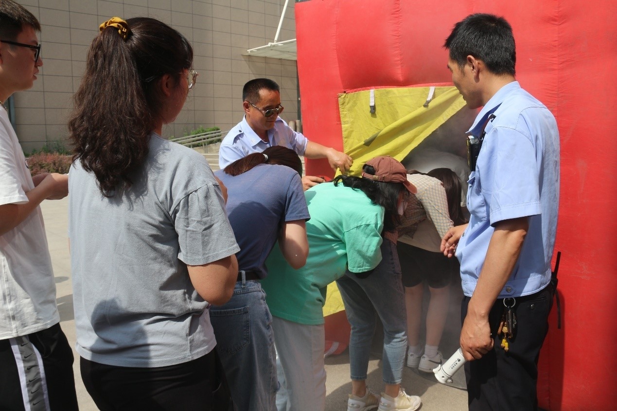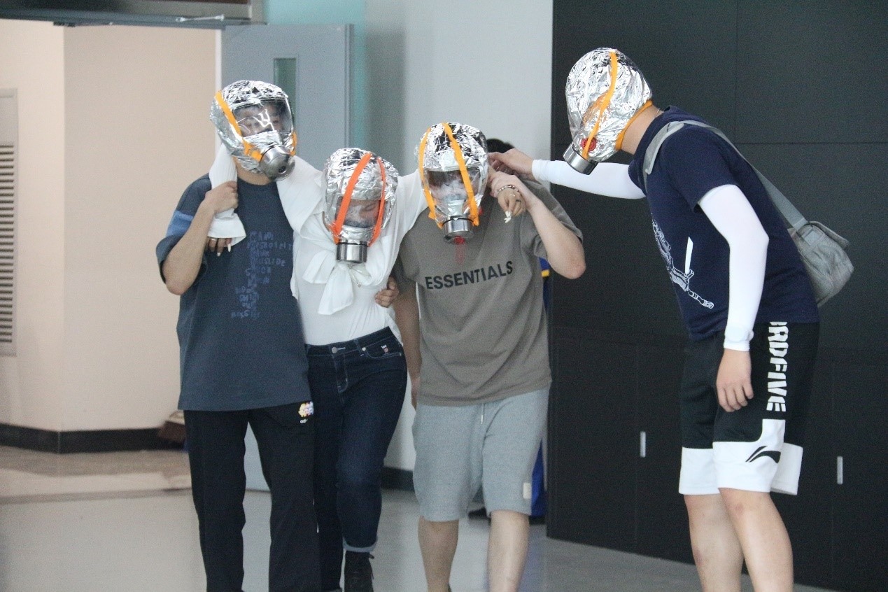 逃生演练结束后,同学们有序在原集合位置排队集合,进行此次体验活动的第二部分,即烟雾气模体验。活动开始之前,教官为大家普及了消防知识:火灾中湿毛巾的正确使用方法是将其拧到不滴水的程度,然后对折三次,捂住口鼻。湿毛巾可以保证我们在火场三分钟的有效呼吸时间。由于一氧化碳,二氧化碳不溶于水,所以三分钟以后空气中会迸发出大量的一氧化碳和二氧化碳,因此大家一定要尽量在三分钟之内逃离火场,否则将会有生命危险。随后大家五人一组进入模拟烟仓,烟仓内部一片漆黑,充满浓烟。即便是打开手电筒能见度也不足五厘米。在烟仓内模拟行动时,同学们一个个俯身弯腰,用湿毛巾捂住口鼻,同时右手摸索着挨着墙壁走,最终都在三分钟内逃出了模拟烟仓。教官还提醒已经体验过烟仓的同学不要向其他还未体验过的同学提供路线,因为在真正发生火情时,每个人对于逃生路线的摸索都是未知的、突发的。即便是平时的演练,我们也要做到对自己和他人负责。