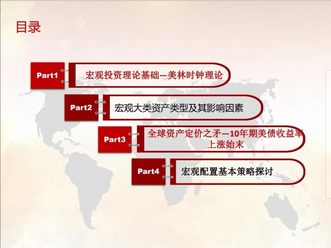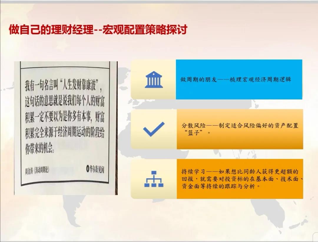 刘红梅老师回顾了上一场讲座所介绍的国际外汇市场和黄金市场,结合多年从事国内外银行外汇交易及客户营销的丰富工作经历,从宏观理论投资基础、宏观大类资产类型、美债收益率上涨的始末和宏观配置基本策略四个方面,与同学们分享了有关资产配置的心得。第一部分由一张有趣的图鉴引出顺资产周期和高估值资产,向同学们解释了美林时钟理论以及改良的中国投资理论。第二部分讲述宏观资产配置逻辑,列举了五大类资产并着重介绍了债权基础知识,以及影响全球资产配置的核心要素——利率与通胀,经济增长趋势以及资产估值。第三部分回顾了美债收益率上涨的原因——经济复苏的预期。在第四部分中,刘红梅老师建议同学们梳理宏观经济周期逻辑,要做周期的朋友,找到适合自己的风险偏好,根据自己的风险偏好和年龄进行资产的大类配置,无论是基本面、技术面、资金面还是心理层面都要持续学习。