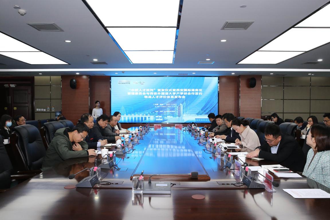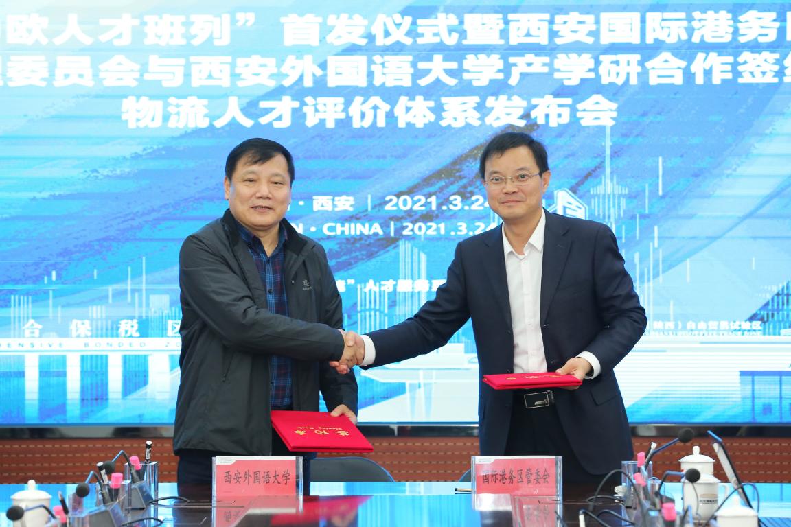 2021年3月24日上午,“中欧人才班列”首发仪式暨西安国际港务区管理委员会与青青草视频 产学研合作签约仪式在西安国际港务区管委会综合楼501会议室举行。西安国际港务区管委会党工委副书记苗吉,党工委组织部部长韩婷婷,招商二局局长魏玮,陕西省物流学会执行会长兼秘书长别家昕,我校总会计师李瑞平,青青草视频 党委书记魏锋,青青草视频 院长兼出国留学人员培训部(国际学院·继续教育学院·考试管理中心)主任、院长李村璞,青青草视频 副院长吕寒出席仪式。港务区部分工作人员和30余名区内企业代表参加了签约仪式。