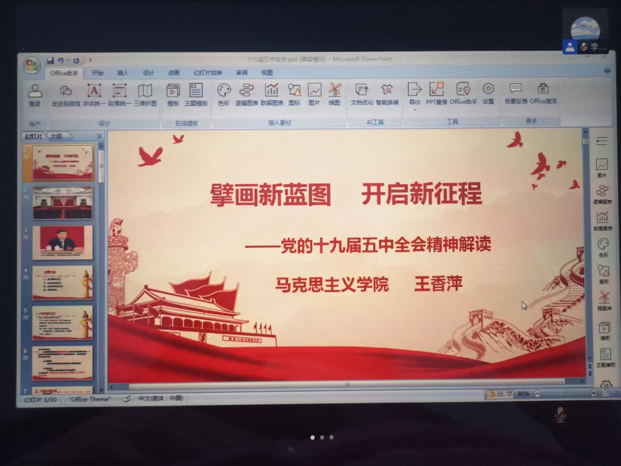 会议开始,王香萍老师为同学们深刻剖析了十九届五中全会的重要内涵,同时为大家详细讲解此次全会的具体内容,使得同学们深入学习理解党和国家事业取得的非凡成就,从中切实领悟到习近平新时代中国特色社会主义思想的实践伟力,揭示党的领导、领袖领航、制度优势、人民力量的关键作用,从而更加自觉地增强“四个意识”、坚定“四个自信”、做到“两个维护”,更加广泛有效地为党凝聚青年,当好党的助手和后备军。其次,王老师还从此次会议的突出亮点及特点为同学们更加深入地讲解了全会内涵,党的一系列战略性、创新性举措为新发展的全过程奠定了基础。会议最后,团支书李雨星和支部数位成员分享了自己今天的学习体会,从大家的发言中,能够看出同学们对于新时代党作出的重大经济社会战略决策有了更好的理解,清楚党对群团组织的要求和青少年工作的结合点。支部成员结合了十九届五中全会精神和自己的认识提出作为青年大学生和法学生,要学好专业知识,为国家法制建设添砖加瓦,贡献自己的一份力量。