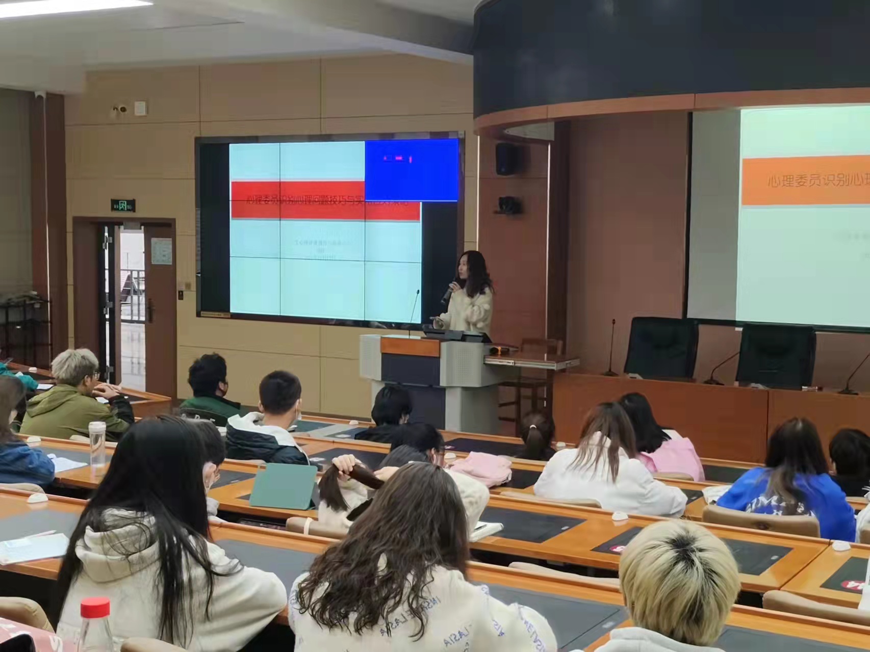 讲座上,刘佳老师针对大学生的心理特点以及容易遇到的各种困扰,用幽默诙谐的语言,为同学们讲述了抑郁情绪和抑郁症的特征及区别,教授了预防抑郁情绪的多种方法和干预机制,在与学生的问答互动中,生动讲述了心理委员在工作中对于抑郁症快速识别的方法。