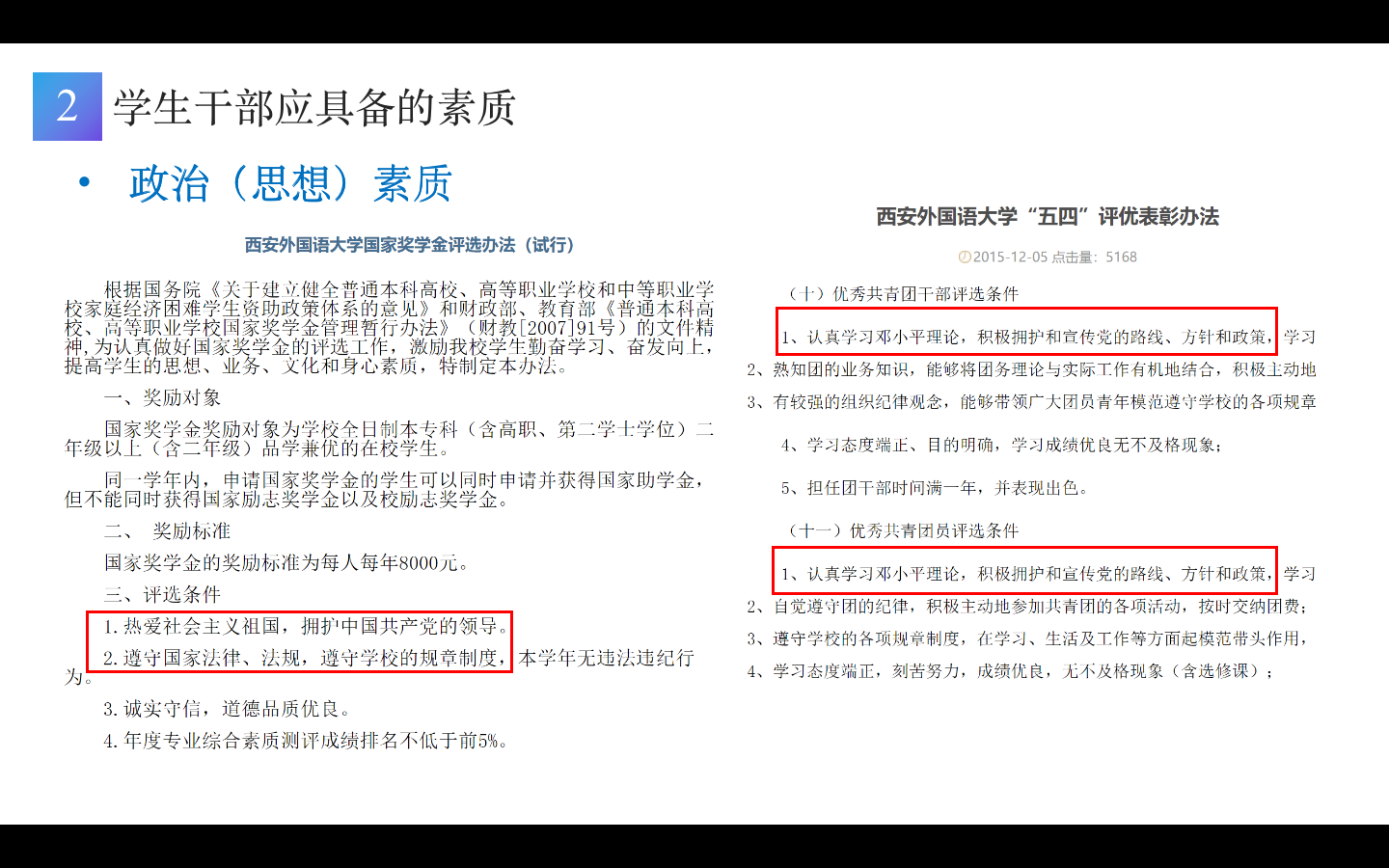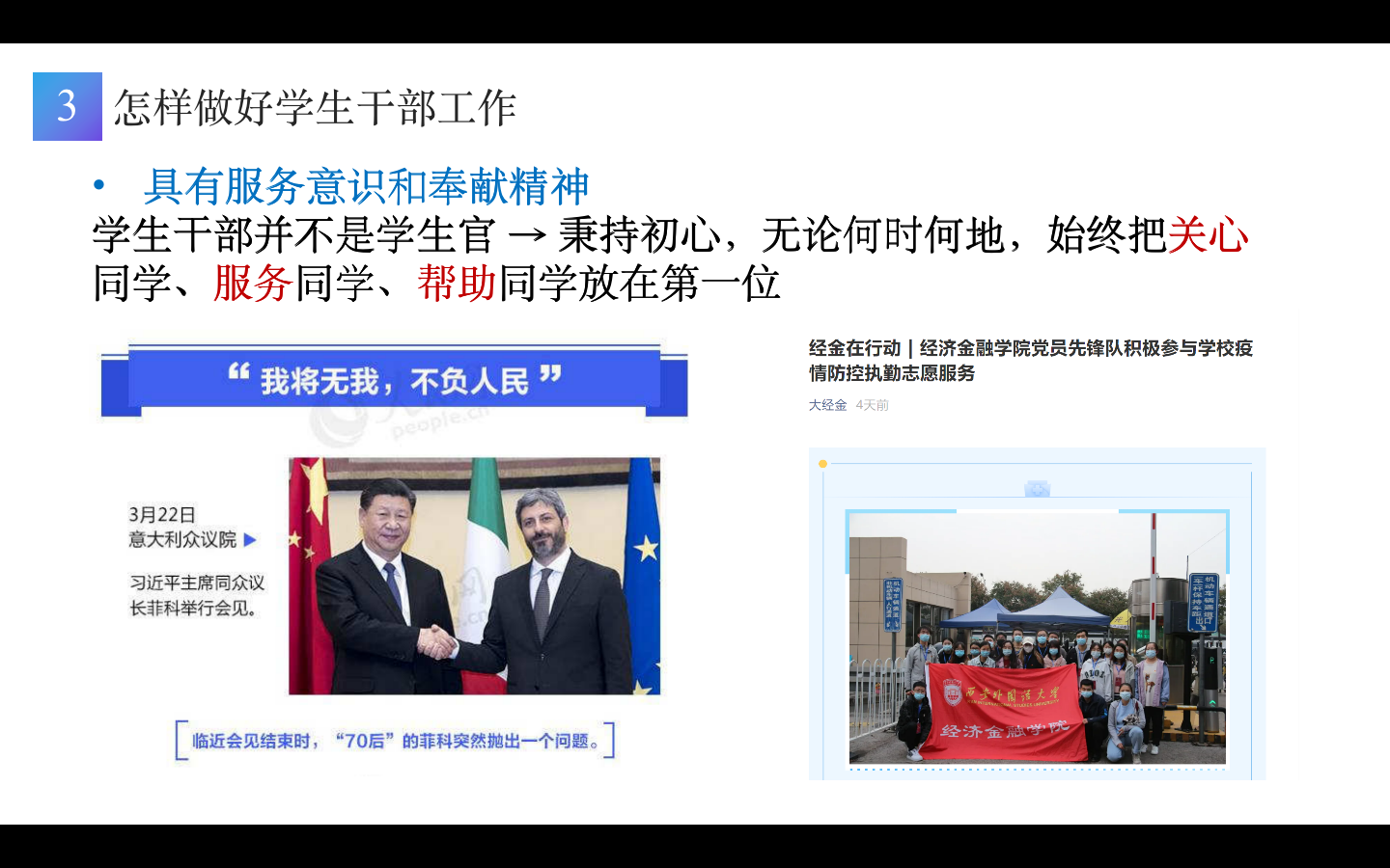 培训会上,青青草视频 2021届优秀毕业生孟祥升从学生干部的自我定位、必备素质以及如何做好学生干部工作三个方面,为青青草视频 全体学生干部带来了一次别开生面、意义非凡的经验分享。孟祥升同学曾担任第九届团委副书记、第八届团委学生会主席、金融党支部副书记、金融1703班长,并获得第二届“最美西外人”之“最美学生”荣誉称号。首先,他通过结合自己的学生工作经验,号召广大学生干部应牢记学生干部的初心和使命,坚持“奉献自己、服务他人”,坚决杜绝出现各种“官僚作风”,摆正心态,不忘初心,做一名为老师、同学服务的学生干部。