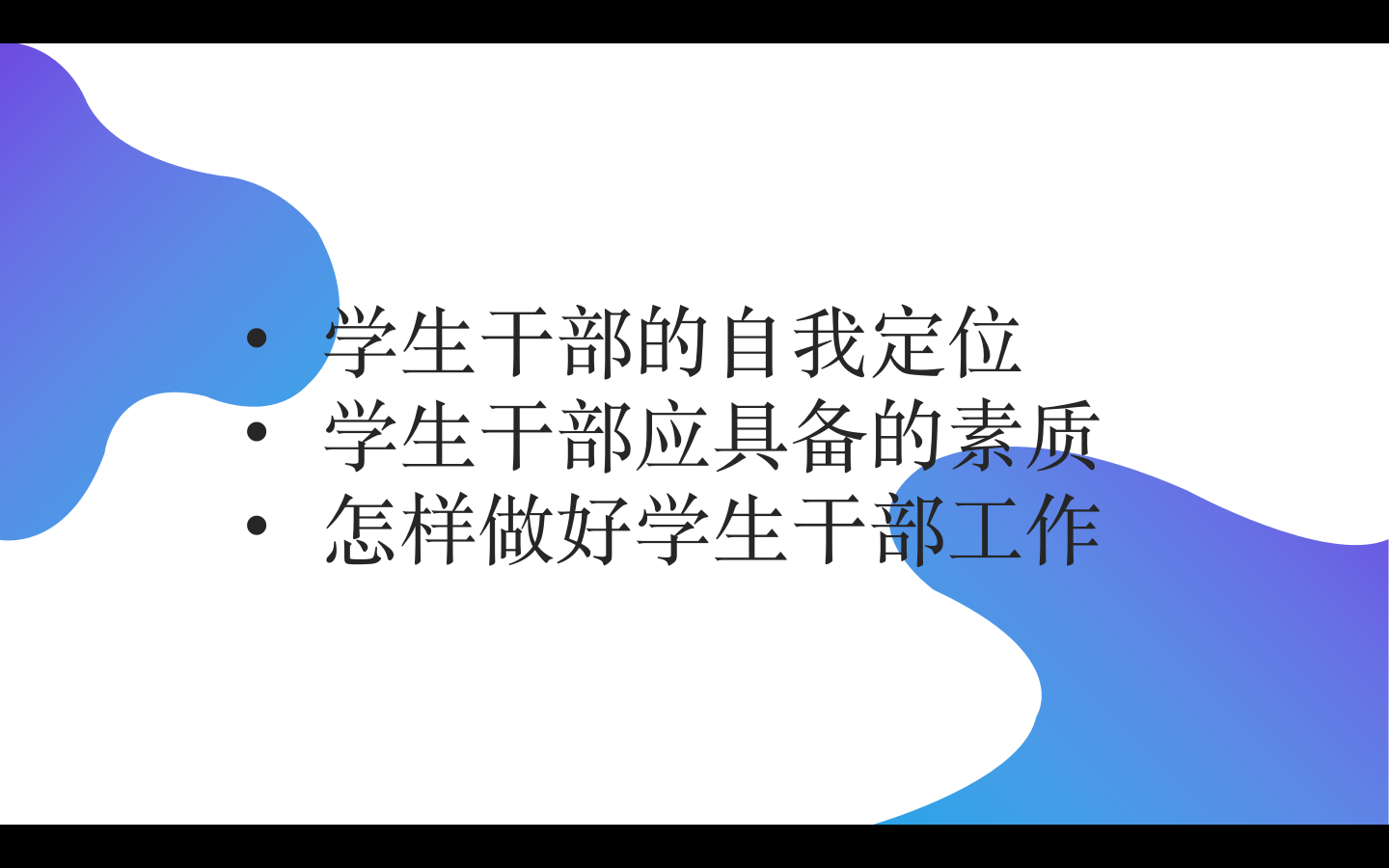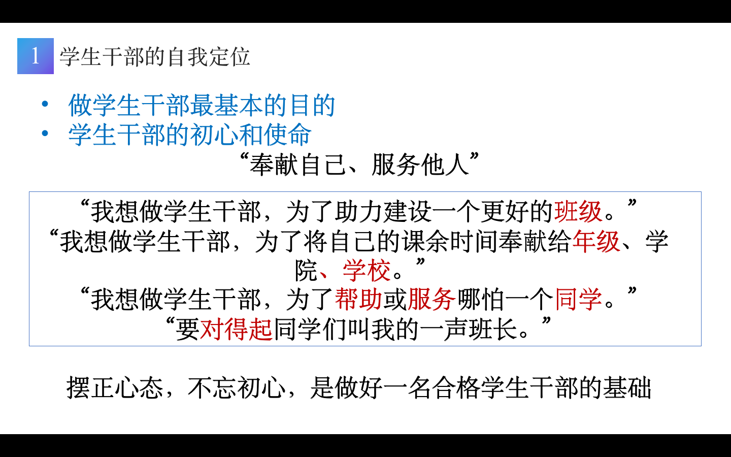 其次,他提出在自我素质方面,第一,要坚持理想信念,提高政治素质。这就要求学生干部在观察和处理问题时,要立场坚定、是非分明。第二,树立良好三观,提高道德素质。学生干部要提高道德修养,正确处理好个人与集体利益之间的关系,乐于奉献,做好同学们的榜样和表率。第三,增强专业能力,提高知识素质。要统筹好学习与工作的关系,作为一个优秀的学生干部,必须要学习成绩优秀,这样才能在同学中树立威信,才能把知识性和思想性融入活动中,才有可能形成凝聚力更强大的集体。同时,他强调要具有良好的心态,注重培养自己各方面的心理承受能力,从而提升自身心理调适能力及人际交往能力。
