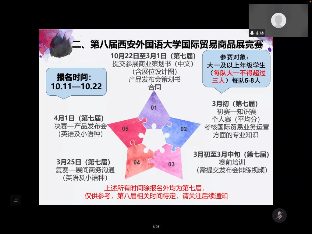 欧洲学院史林老师就西班牙语同学参赛进行详细指导补充。史林老师就历年参赛情况进行介绍。我校已有连续三年有以西班牙语来参赛组队的经验,该竞赛着重考察参赛同学的外语+专业,参赛同学亲身参与进而拓展国际贸易知识,丰富自身能力,对西语学生转型发展有良好推动力。