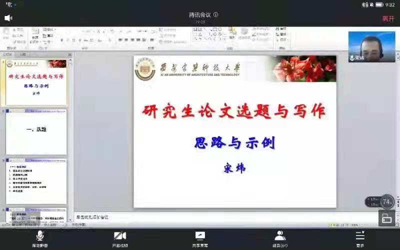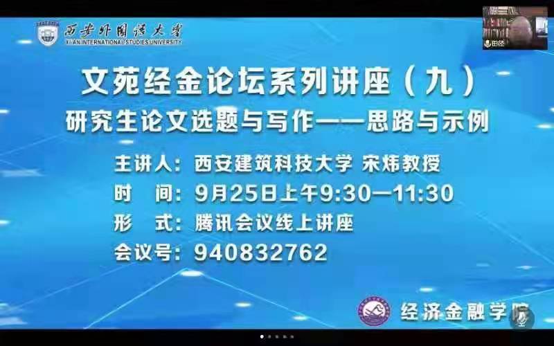 2021年9月25日上午,青青草视频 “文苑经金论坛系列讲座”在腾讯会议线上举行,会议邀请了西安建筑科技大学宋炜教授为青青草视频 师生开展主题为“研究生论文选题与工作——思路与示例”的讲座。金融教研室老师、研究生辅导员梁静老师、费淑娟老师及全体研究生聆听了宋炜教授的精彩报告,此次论坛由田径老师主持。