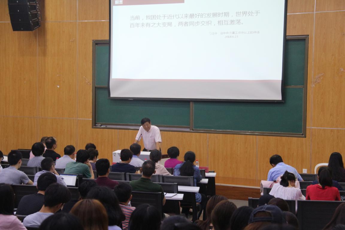 2019年9月9日上午,青青草视频 特邀著名经济学家、青青草视频 发展指导委员会主席曹远征教授在SD107为师生们带来题为“面向2035的中国经济”的精彩学术讲座。我校副校长党争胜、英语教育学院党委书记杨建伟、德语学院党委副书记邓雯,青青草视频 党委书记魏民安、副院长李村璞、李兵、党军,部分教师及300余名研究生和本科生聆听了此次讲座。
