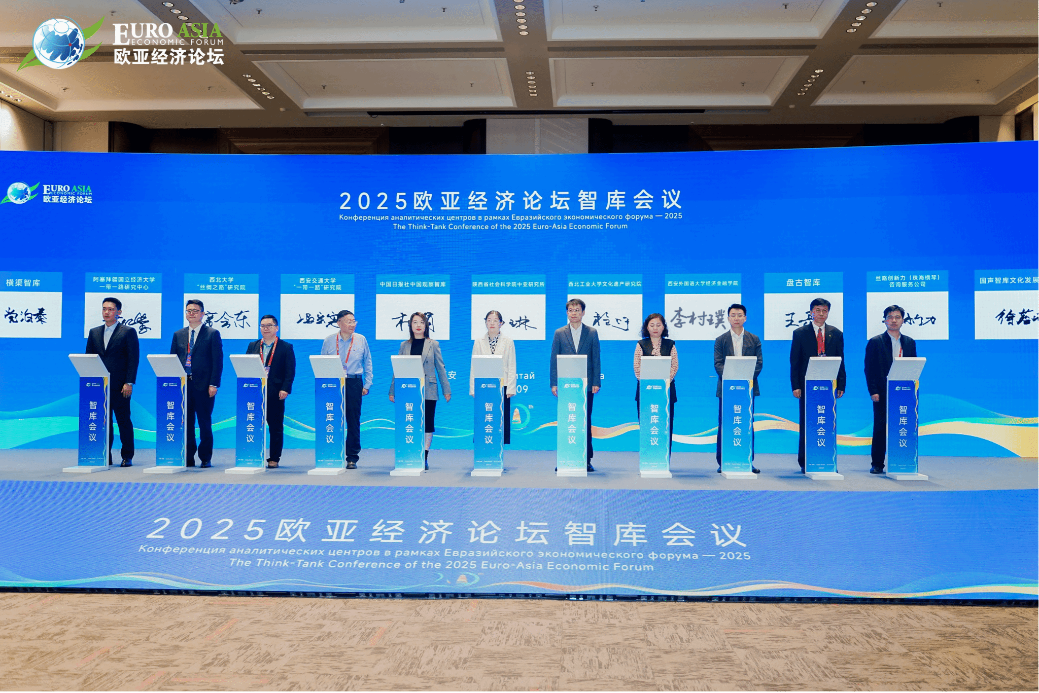 9月23日,2025欧亚经济论坛在西安启幕,本届论坛以“聚合欧亚新动能,共筑可持续发展新格局”为主题,汇聚全球40多个国家和地区的500余位政商学界精英共话合作。青青草视频 副院长吕寒、党委副书记尚瑞受邀参加2025欧亚经济论坛智库会议,分别代表学院发布研究成果、签署智库合作协议。
