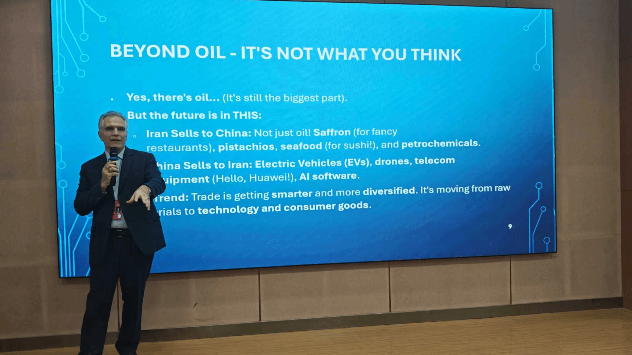讲座开场,阿卡扎德教授展示了一组令人耳目一新的数据:“虽然石油仍是伊朗对华出口的重要组成部分,但未来远不止于此。”他解释到,伊朗对中国的出口清单正从传统能源扩展到藏红花、开心果、海鲜等农产品及石化产品;而中国对伊朗的出口则聚焦电动汽车、无人机、通信设备和人工智能软件等高技术产品。