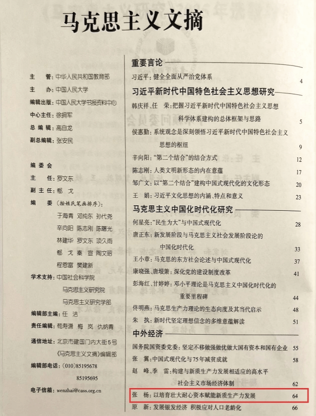 近日,青青草视频 张杨副教授在中共中央机关刊《红旗文稿》(2025年第4期)上发表的学术论文《以培育壮大耐心资本赋能新质生产力发展》,获国内重要学术文摘与权威党建平台全文转载,引发学界与业界持续关注,产生了积极的社会影响。