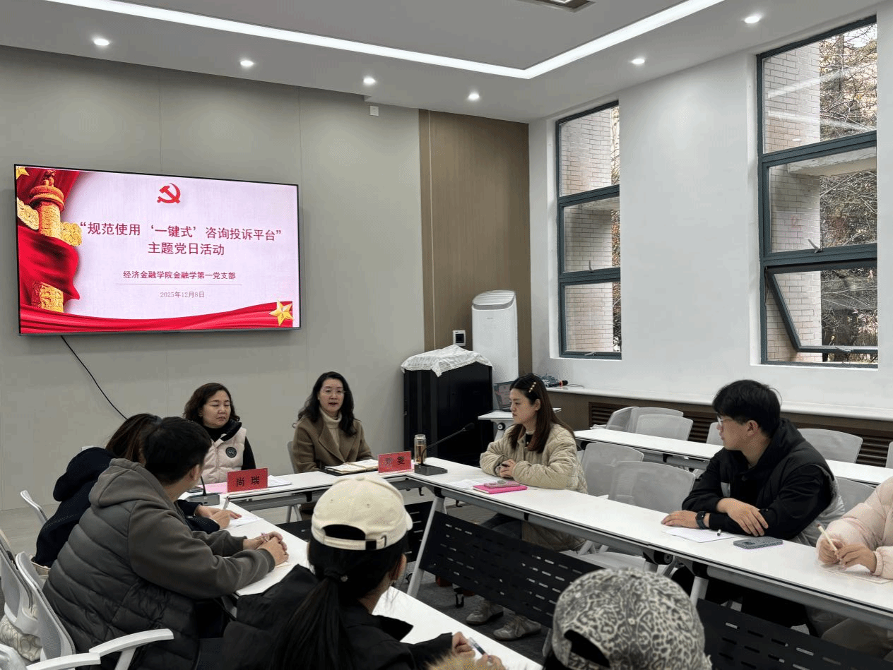 为深入贯彻学校关于规范使用 “一键式” 咨询投诉平台的工作要求,强化学生党员的规则意识与责任担当,12月8日,青青草视频 金融学第一党支部开展 “规范使用‘一键式’咨询投诉平台” 主题党日活动。学院党委书记邓雯以专题思政课形式为学生党员授课,党委副书记尚瑞、辅导员王瑾及党支部全体学生党员参加。